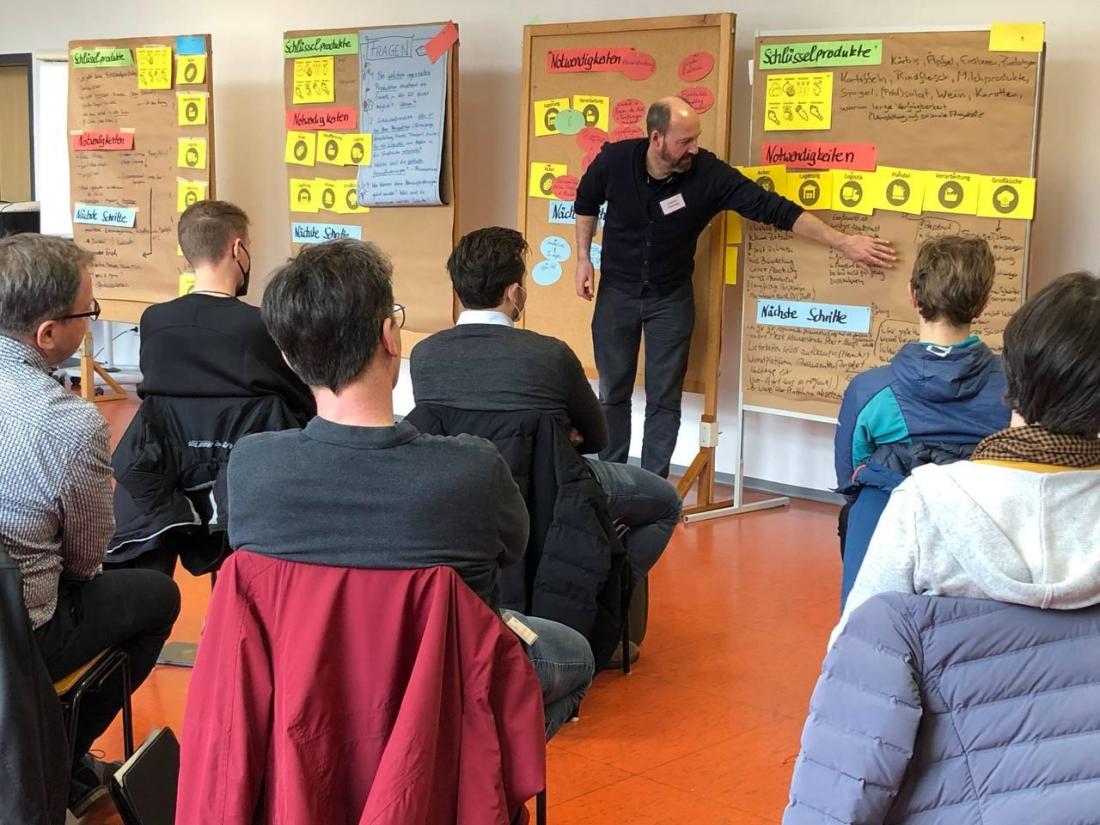 Weiterhin überlegten die Teilnehmenden, welche Produkte sich besonders eignen, um eine regionale Versorgung von Großküchen schrittweise aufzubauen. Insbesondere gut lagerfähige Produkte mit einer langen Tradition in der Region wie beispielsweise Karotten, Kürbisse, Kartoffeln, Äpfel, Feldsalat, Beeren oder auch Wein wurden hier genannt. Diese könnten recht einfach regional bezogen werden und eignen sich daher als Ansatzpunkte zum Aufbau lokaler Wertschöpfungsketten.