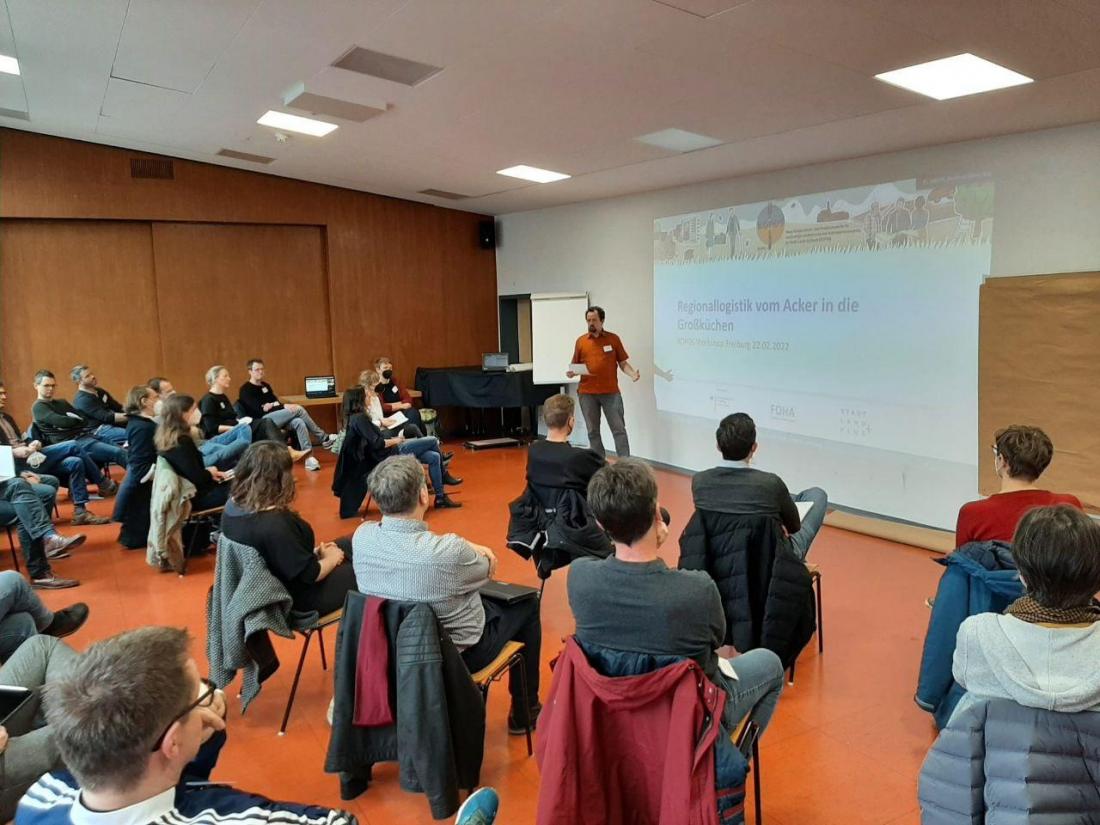 Bei dem Workshop „Regionallogistik vom Acker in die Großküchen“ kamen verschiedene Praxisakteur*innen aus Produktion, Logistik, Handel, Verarbeitung und Gemeinschaftsverpflegung im Raum Freiburg zusammen, um die Frage „Wie kann die Versorgung mit regionalen Produkten in Großküchen gestärkt werden?“ zu diskutieren.