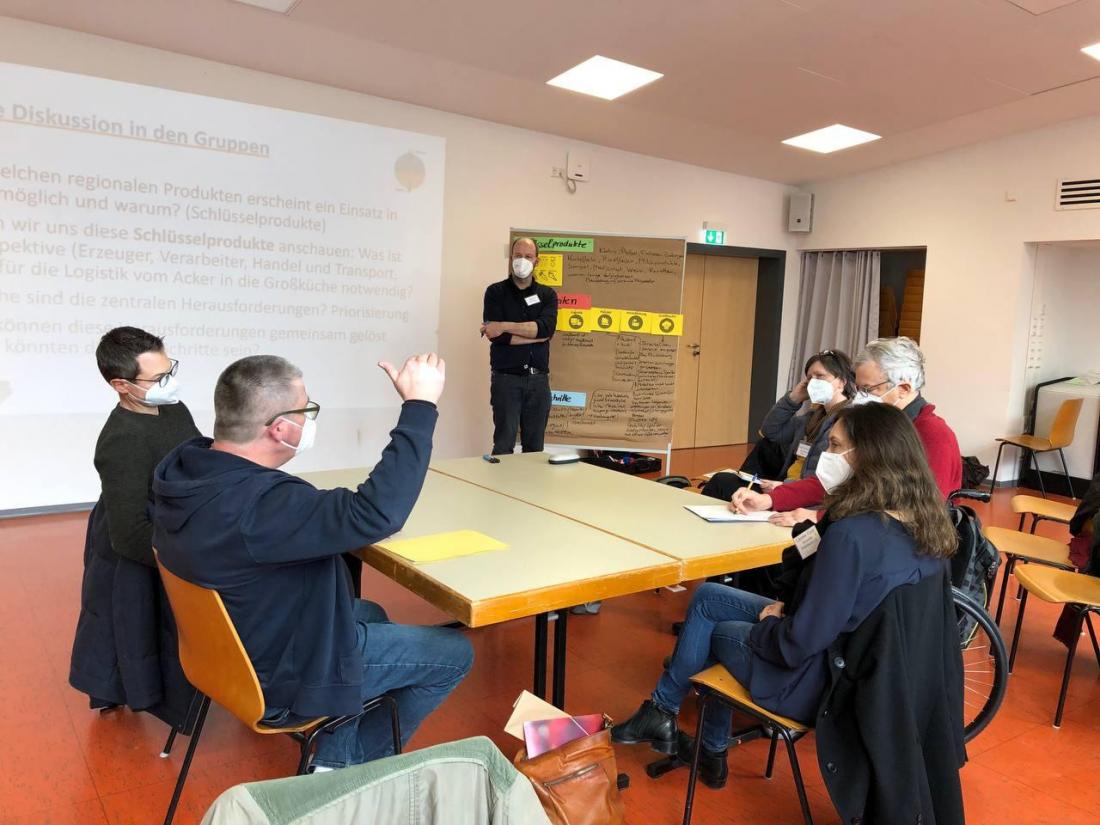 Danach gab es für die über zwanzig Teilnehmenden die Möglichkeit, sich in kleineren Gruppen über ihre Erfahrungen zum Thema Logistik und Bündelung von regionalen Produkten für Großabnehmer in der Außer-Haus-Verpflegung in und um Freiburg auszutauschen. Häufige Schwierigkeiten und Herausforderungen, aber auch ganz konkrete Lösungsansätze und Strategien wurden diskutiert. Am Ende wurden diese dann in der großen Gruppe präsentiert.