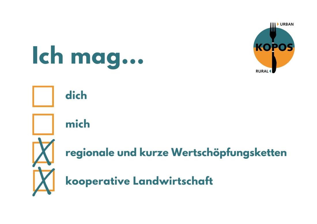 Diese Postkarte wurde für die KOPOS Modellregion Freiburg erstellt. Dort forschen die KOPOS-Projektpartner:innen an der Herausforderung fehlender kurzer – sprich: regionaler – Wertschöpfungsketten für Nahrungsmittel.